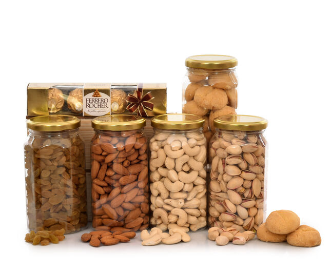 • Items -200g cashews, 200g almonds, 200g raisins, 200g pistachio, 200g cookies, ferrero, tilak kit.
