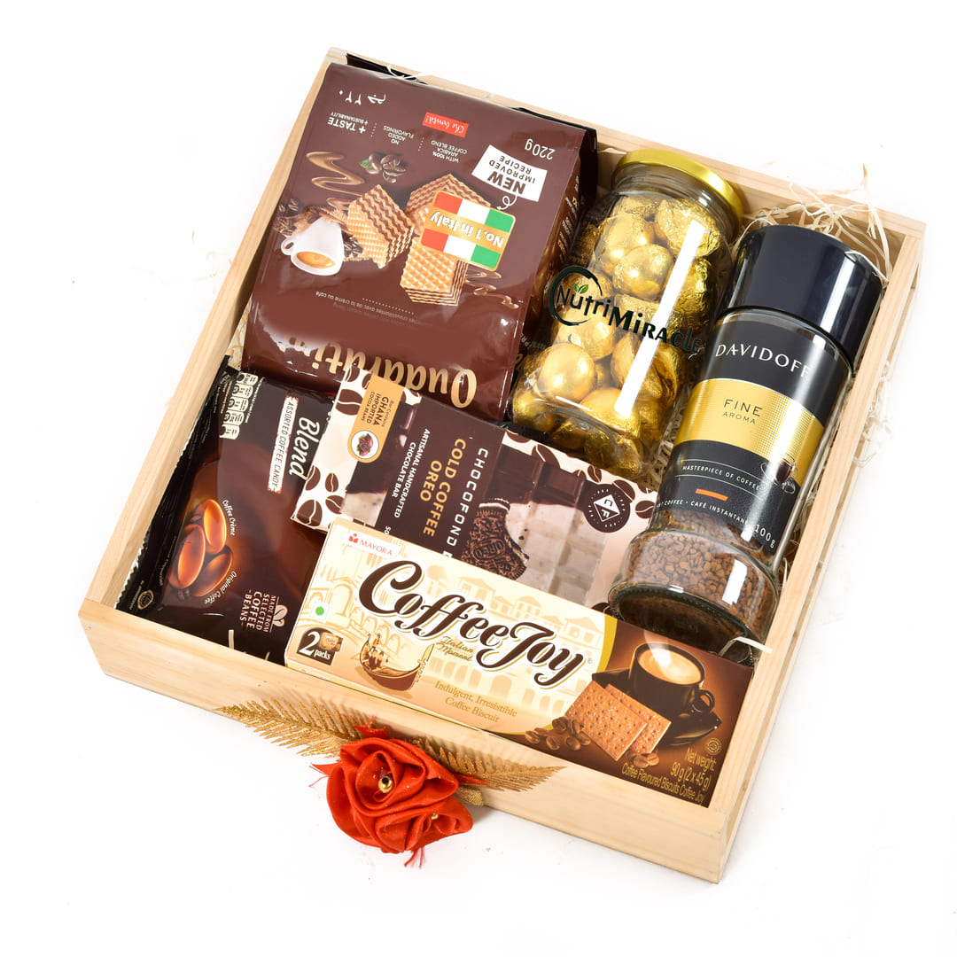 - Package content: Nutri miracle flower studded wooden gift box/hamper Coffee Joy Biscuits, Quadratini Espresso Wafers, Davidoff Fine Aroma Instant Coffee, Fox’s Assorted Coffee Candies, Chocofond Cold Coffee Oreo, 100gm Handmade Chocolates and Ferrero Rocher
