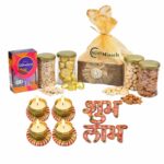 - Items – cashews, almonds, ravdi, handmade chocolate, celebrations chocolate pack, ethnic shubh labh wall/door hanging, and handcrafted Diyas.