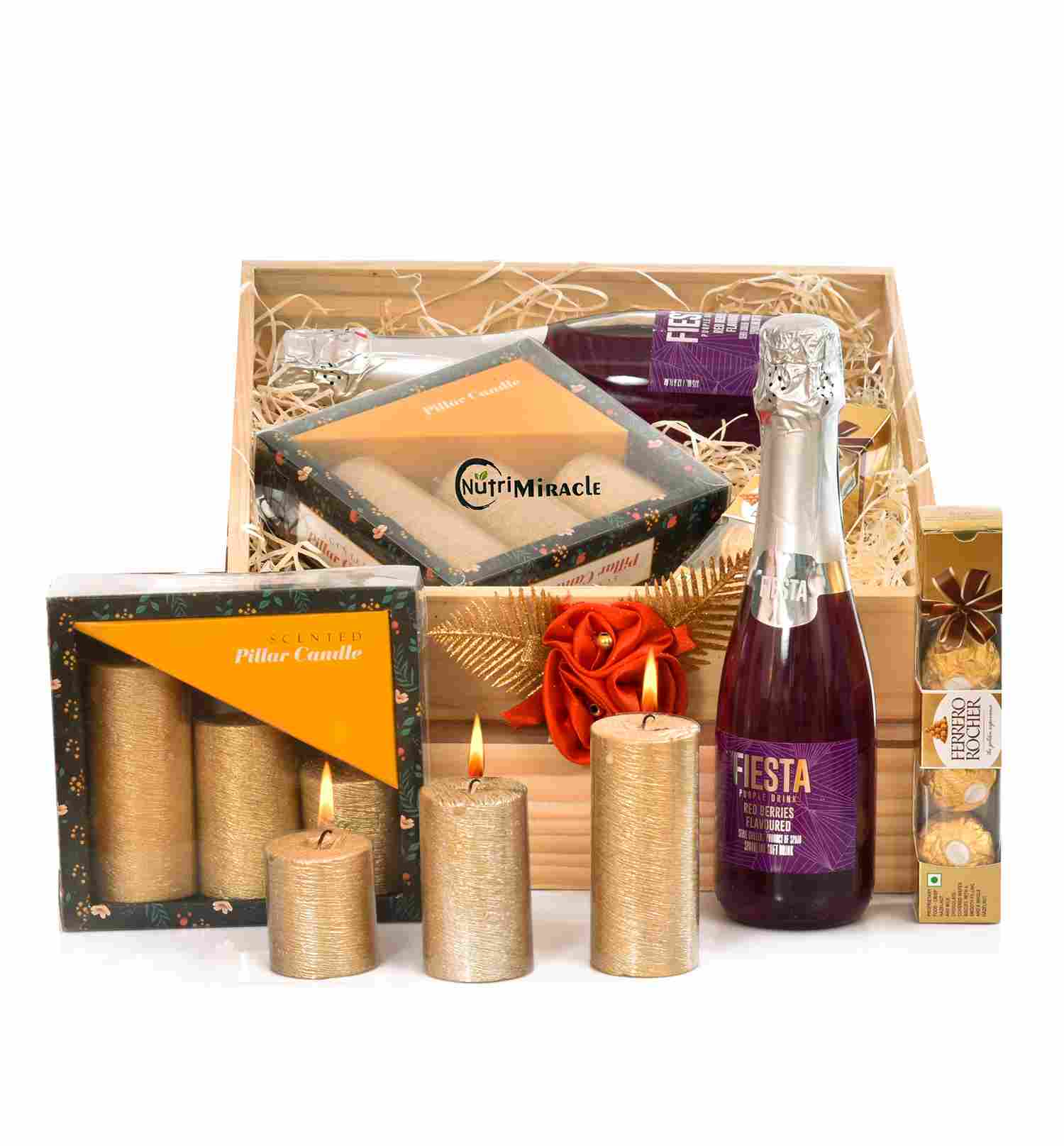 - Package content: Red Berries Flavoured Champagne, Ferrero rocher, and Pillar Candles.