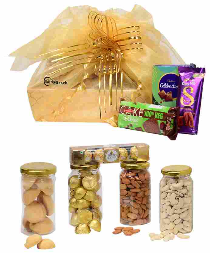 • Package content: 100gm cashews, 100gm almonds, 100gm cookies, 100gm handmade chocolates, Britannia cake, Ferrero Rocher, Cadbury silk, celebrations chocolate pack, and handcrafted Diyas.