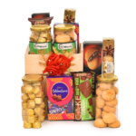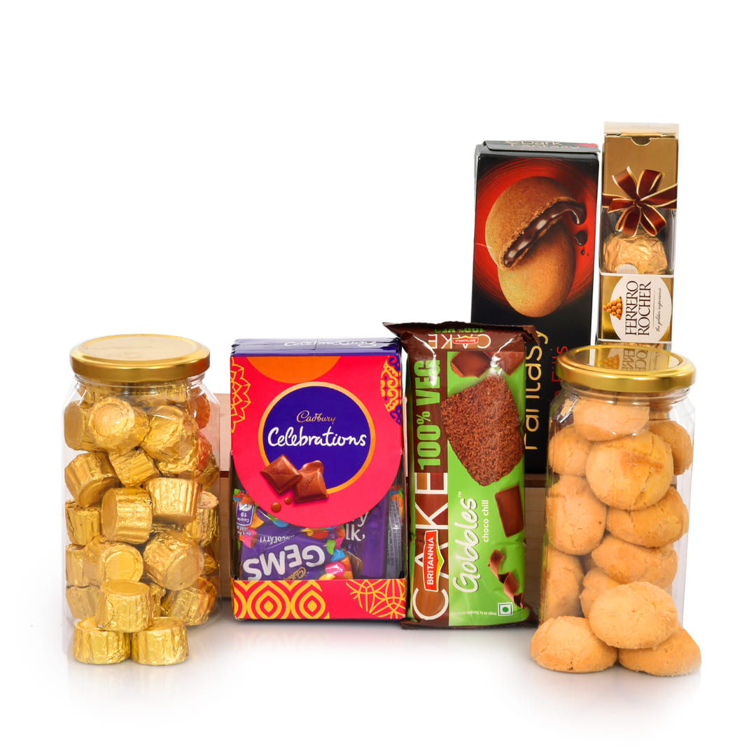 - Items – celebrations chocolate pack, Ferrero Rocher, dark fantasy, Britannia cake, Swiss chocolates and cookies.